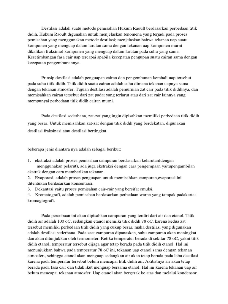 Destilasi Adalah Suatu Metode Pemisahan Hukum Raoult Berdasarkan Perbedaan Titik Didih. Destilasi adalah proses fisika yang tidak terdapat reaksi kimia saat sedang berlangsung proses tersebut. Dalam proses metode ini, campuran zat akan mendidih sehingga terjadilah penguapan, dan uap yang dihasilkan ini kemudian akan mendingin kembali dan berubah bentuk menjadi cairan. Proses dari destilasi ini akan melibatkan penguapan campuran, yang diikuti dengan proses pendinginan. Jenis destilasi yang pertama adalah destilasi biasa ataupun destilasi sederhana. Beberapa pendapat para ahli mengenai pengertian destilasi adalah sebagai berikut : Jika campuran dipanaskan maka komponen yang mempunyai titik didih lebih rendah akan menguap terlebih dahulu. Pengertian destilasi (penyulingan) adalah metode dimana bahan kimia dipisahkan menurut perbedaan kecepatan, volatilitas dan kemudahan bahan tersebut menguap. Destilasi biasa atau destilasi sederhana ini biasanya dengan menaikan suhu, tekanan uapnya berada diluar cairan. Dasar utama pemisahan dari destilasi adalah perbedaan pada titik didih cairan dengan tekanan tertentu. Destilasi adalah metode pemisahan dan pemurnian dari cairan yang mudah menguap.