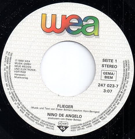 45cat Nino De Angelo Flieger Laureen Wea Germany 247 023 7. Du und ich, wir sind so hoch geflogen vor gar nicht langer zeit ein flugzeug voll mit jungen träumen stand für uns bereit. Germany finished 14th at eurovision 1989 with 46 points. Flieger by nino de angelo from germany at eurovision song contest 1989. Du und ich wir sind so hoch geflogen vor gar nicht langer zeit ein flugzeug voll mit jungen träumen stand für uns bereit das mit uns war so groß wir eroberten den himmel warum liess't du mich nur los ohne fallschirm in der nacht? More by nino de angelo. Du gehst nicht raus aus meinem herzen. Nino de angelo (born domenico gerhard gorgoglione on 18th december 1963 in karlsruhe, germany) is a german actor and singer of italian ancestry, being best known for his environmental protest song jenseits von eden (english: Ich hab die zeit nie ganz vergessen. Ich denk nur noch daran. Dies ist der offizielle channel von nino de angelo.